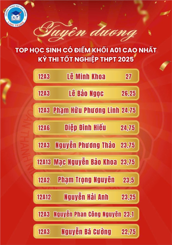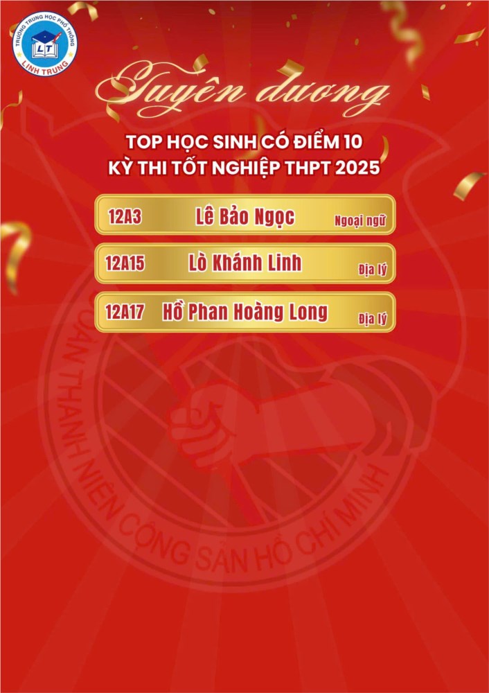 🏅 Với niềm tự hào to lớn, Đoàn trường THPT Linh Trung xin chúc mừng và vinh danh các bạn học sinh khoá 2022 - 2025 đã có điểm thi cao nhất trường, những đại diện tiêu biểu cho tinh thần học tập, sự bền bỉ và khát vọng vươn xa. Mỗi con số đều là minh chứng cho hành trình đầy nỗ lực và kiên cường. Đằng sau những điểm số ấy là bao ngày tháng học tập miệt mài không quãng ngại khó khăn.